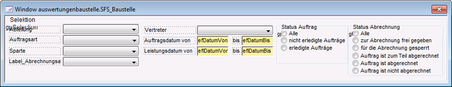 SFS_Eingabe...Im Eingabefenster werden die Selektionslisten und Felder angelegt.
