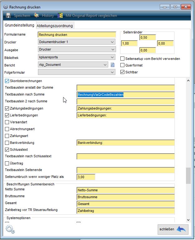 Wenn Sie in diesem Fall informationen aus den Positionen in den Textbaustein einbauen wollen, müssen Sie den Schalter Textbaustein Rechnung via QR Code bezahlenAb Version 19091920 gibt es eine neue Funktion welche mittels Textbaustein in eine Rechnung eingebaut werden kann. -> Das vereinfachte Bezahlen der Rechnungen via QR Code. Damit ein Techniker diesen QR Code beim Kunden einfach einbauen kann, haben wir im BIN Ordner der Kplus Version im Verzeichnis options/Reports den Textbaustein "InvoiceQrCode.kpt" hinterlegt. Voraussetzungen