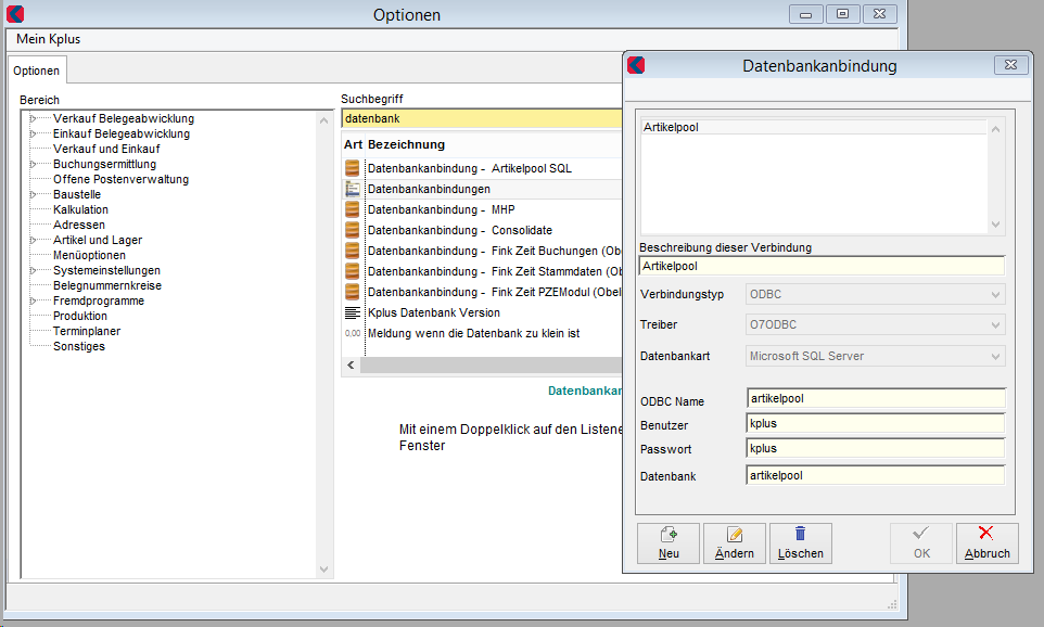 Danach muss der Artikelpool noch in Kplus eingerichtet werden. Dazu die Optionen öffnen und die Option "Datenbankanbindungen" auswählen. Hier die ODBC-Verbindung vom Artikelpool angeben. Könnte wie im folgende Beispiel aussehen: