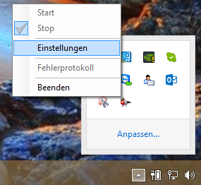 Sie können es vom Infobereich wieder starten, indem Sie mit der rechten Maustaste auf das Symbol und dann mit der linken Maustaste auf „Einstellungen" klicken.