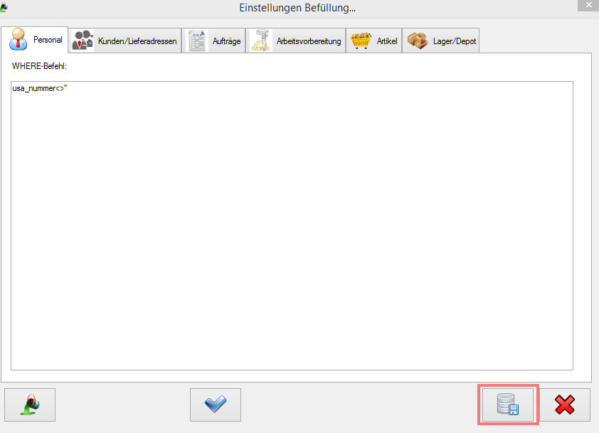 Sie können in den verschiedenen Reitern die Befüllungen durch SQL-Where-Statements einschränken. Die Schlüsselwort „Where" muss bei der Formulierung weggelassen werden. Das angeführte Statement dient nur als Beispiel. Hier müssen Sie Ihre eigenen Formulierungen herausfinden. Die Reiter „Artikel" und „Lager/Depot" funktionieren nicht und brauchen deshalb nicht konfiguriert werden.