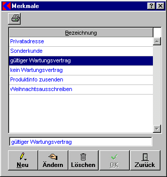 startet den Ausdruck einer Liste aller angelegten Merkmale. - In der Liste unter Bezeichnung sehen Sie alle bereits angelegten Merkmale.