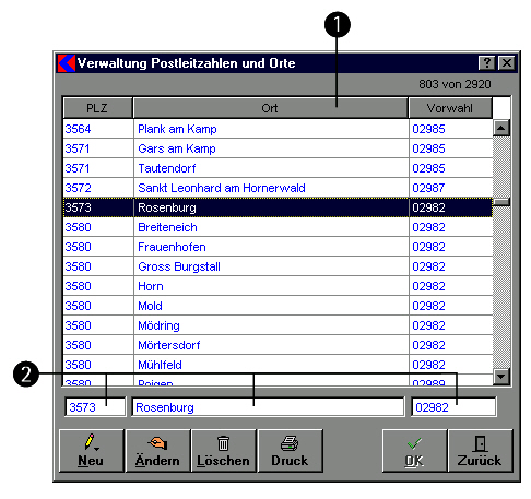 - Dieses Feld zeigt Ihnen alle angelegten Postleitzahlen mit dem dazugehörigen Ort und der entsprechenden Vorwahl.
