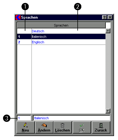 - Felder für das Anlegen eines neuen Eintrags oder zum Bearbeiten schon angelegter Spracheinträge.