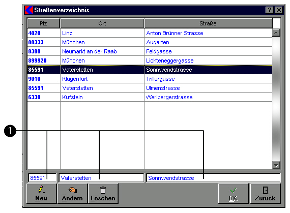 - Um einen neuen Eintrag im Straßenverzeichnis anzulegen, klicken Sie auf die Schaltfläche Neu. Das Feld für die Eingabe der Daten wird aktiviert. Geben Sie im linken Feld die Postleitzahl für den Ort, im mittleren Feld den zur Postleitzahl gehörenden Ortsnamen und im rechten Feld die Straße ein. Bestätigen Sie die Dateneingabe mit der Schaltfläche OK.