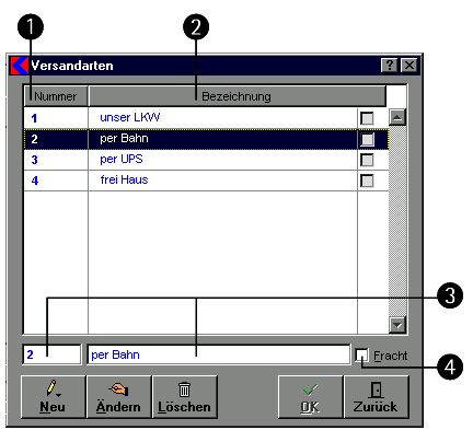 In dieser Maske legen Sie eine Liste für verschiedene Versandarten an oder bearbeiten bereits vorhandene. Die Versandart zeigt bei den Adressen an, auf welche Weise zu versendenden Artikel zu den Kunden gelangen. Die Daten werden den Zusatzdaten zu einer Adresse verwendet.