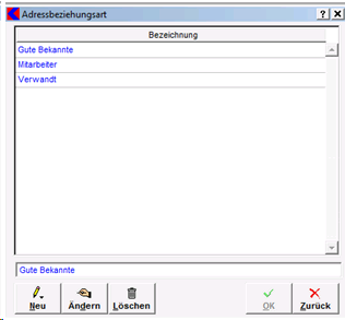AdressbeziehungsartDieses Fenster finden Sie unter Datei -> Einstellungen -> Einstellungen Stammdaten -> Einstellungen Adressen -> Adressbeziehungsstamm.