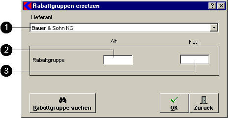 - Eingabefeld: Rabattgruppe neu Hier ist die neue Rabattgruppe, zu diesem Lieferanten einzutragen. Die neue Rabattgruppe ist, vor dem Ersetzen anzulegen.