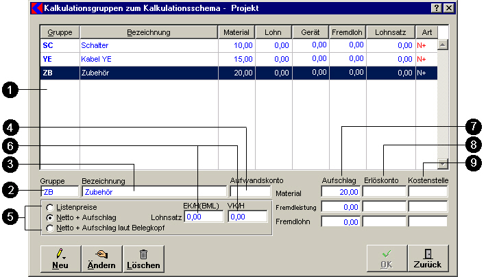 - Listenfeld: Hier sind die einzelnen Gruppen mit Aufschlägen gelistet. In der Spalte Art wird die ausgewählte Option Nr. 5 in roter Schrift dargestellt.