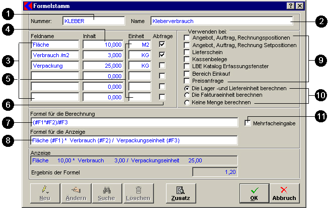 - Nummer: Eingabefeld für Vergabe einer Artikelnummer oder Kürzel für die Formel