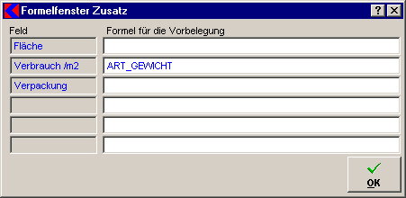 Nach Zuweisung einer Formel zu einem Artikel können mit Klick auf die Schaltfläche in den Artikelzusatzdaten bereits vordefinierte Werte zu einzelnen Artikeln eingetragen werden.