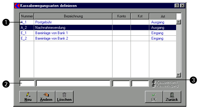 - Optionen: Geben Sie bei einer Neuanlage oder einer Änderung hier an, ob es sich um einen Kasseneingang oder einen Kassenausgang handelt.