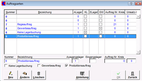 - KL: Wenn dieses Kontrollkästchen markiert ist, wird für diese Auftragsart keine Lagerbuchung vorgenommen.