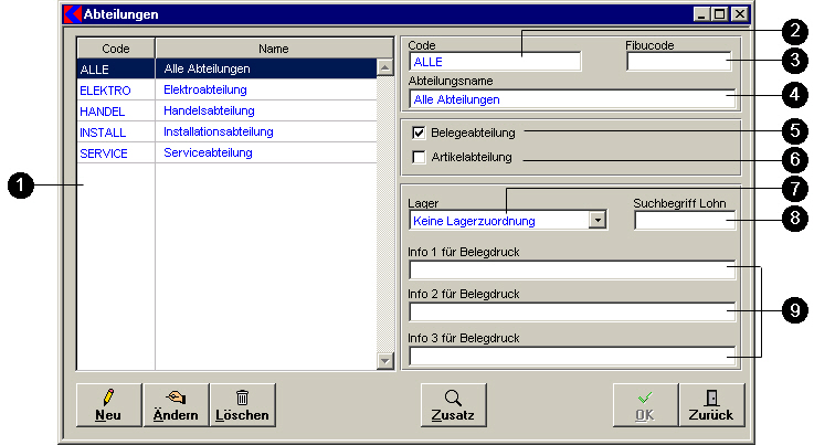 Achtung: Das Löschen eines Eintrags kann zu Komplikationen führen, wenn Sie an anderer Stelle Bezüge zu diesem Eintrag erzeugt haben. - Mit Klick auf die Schaltfläche Zusatz öffnet sich ein Fenster, wo Zusatzdaten zur selektierten Abteilung in der Liste 1 eingegeben werden können. Siehe Zusatzdaten Abteilung
