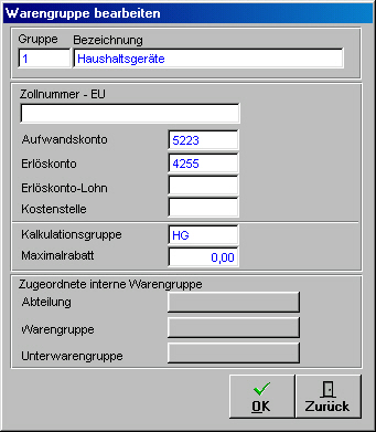 - Kostenstelle: Zur Eingabe der Kostenstelle dieser Warengruppe für die Weiterleitung an die Fibu.