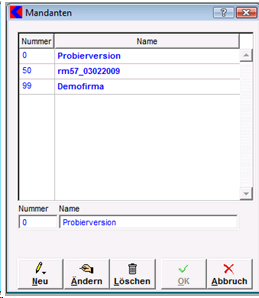 - In der unteren Zeile können Sie eine fortlaufende Nummer und einen Namen angeben, um einen neuen Mandanten anzulegen.
