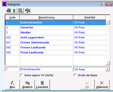 - Hier können Sie nach Klick auf die Schaltfläche Ändern die ausgewählte Kundenkategorie ändern oder nach Klick auf die Schaltfläche Neu eine neue Kundenkategorie erstellen. Dabei können Sie eine Bezeichnung für die Kategorie eingeben und durch Klick auf den Eintrag im Listenfeld ein Preisfeld auswählen.