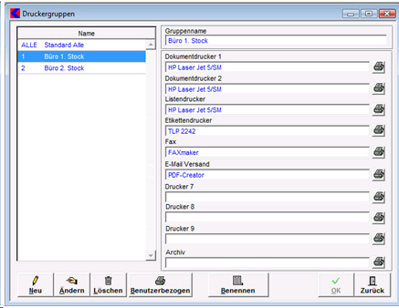 Als vorteilhaft hat sich erwiesen, Druckergruppen wie Büros bzw. Abteilungen in Ihrer Firma anzulegen. Wenn ein Mitarbeiter in verschiedenen Abteilungen/Büros in Ihrer Firma arbeitet, kann dieser die Druckergruppe der entsprechenden Abteilung wählen. (Siehe auch Druckergruppen wechseln). Sie können in einem kleinen Betrieb aber auch pro Benutzer eine Druckergruppe definieren.