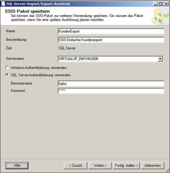 Um den Export für einen Auftrag zu verwenden zu können, muss dieser als SSIS Paket gespeichert werden. Die Speicheroption ist unter der Expressversion nicht verfügbar.
