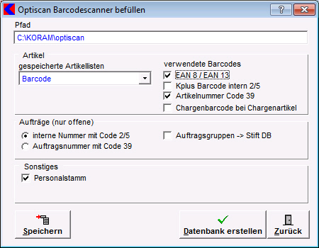 Diese Liste wählen Sie dann hier aus. Diese Liste wird automatisch erweitert wenn Barcodes beim Import erkannt werden die noch nicht in der Liste enthalten sind. Wenn Sie also einen Artikel scannen, welcher noch nicht auf dem Scanner ist, wird dieser beim nächsten Export automatisch auf den Scanner geladen und die Liste für den nächsten Vollexport erweitert. Artikel - Verwendete Barcodes: Kplus verwendet beim Druck der eigenen Etiketten den Barcode 2/5. Bei den Berichten verwenden Sie das Feld DRU_BARCODE und weisen dem Feld die Schriftart Code 2/5 zu. Für hinterlegte EAN Barcodes im Artikelstamm kann man ebenfalls einen Datensatz für den Scanner erstellen lassen. Code 39 muss nur angeklickt werden wenn auch solche Etiketten vorhanden sind. Diese werden üblicherweise nicht von Kplus erstellt. Aufträge: Legen Sie hier fest welcher Barcodetyp in Ihrem Betrieb für den Auftrag verwendet wird. Dies ist üblicherweise in Kplus Code 2/5. In Verbindung mit einer Zeiterfassung oder Archivierung kann dies in Ausnahmefällen auch Code 39 sein. Bei Code 2/5 verwenden Sie im Auftrag DRU_BARCODE_BELEG und in den Journalen DRU_BARCODE jeweils mit der Schriftart Code 2/9 Wenn Sie jedoch Code 39 verwenden, dann erstellen Sie im Bericht ein Feld mit folgender Calculation: Weisen Sie dem Feld die Schriftart Code 39 zu. Damit erkennt dann die Schnittstelle dass es sich um einen Auftrag handelt. Wenn die Einstellungen getroffen wurden, speichern sie die Einstellungen mit einem Klick auf die Schaltfläche Speichern. Um die Datenbank für den Scanner zu erstellen klicken Sie auf die Schaltfläche Datenbank erstellen. Gemischter Betrieb: Wenn Sie unterschiedlich Stifte in einer Umgebung verwenden gibt es ein paar Einstellungen zu treffen.