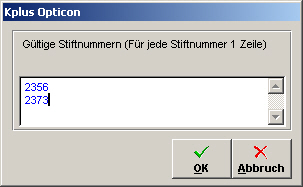 Alle anderen Stifte werden ab dem Zeitpunkt an diesem Arbeitsplatz ignoriert. Wenn Sie die Beschränkung wieder aufheben wollen, bestätigen Sie dieses Fenster ohne was einzugeben. Stiftnummern mit Namen versehen Um den Stiftnummern Namen zuzuordnen legen Sie im Kplushauptverzeichnis eine Datei mit dem Namen Kplus_optiscan_namen.txt an. Darin geben Sie für jeden Stift einen Namen an. Format: Beispiel: 3434,Lagerstift 21656,Aussenstelle Stiftdaten löschen Mit der Tastenkombination 1 und Generelle Einstellungen am Scanner