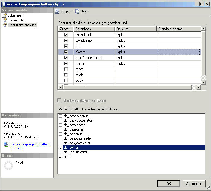 In der Benutzerzuordnung legen Sie den Zugriff des Serverbenutzers auf die jeweilige Datenbank fest.