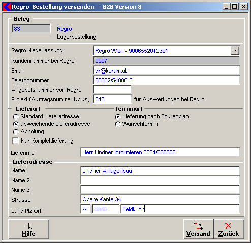 Durch die Eingabe der Projektnummer können Sie bei Regro eine Auswertung der Bestellungen aufgrund der Nummern erhalten. Es wird automatisch die Auftragsnummer aus Kplus verwendet, wenn die Bestellung einem Auftrag zugeordnet ist. - Lieferart