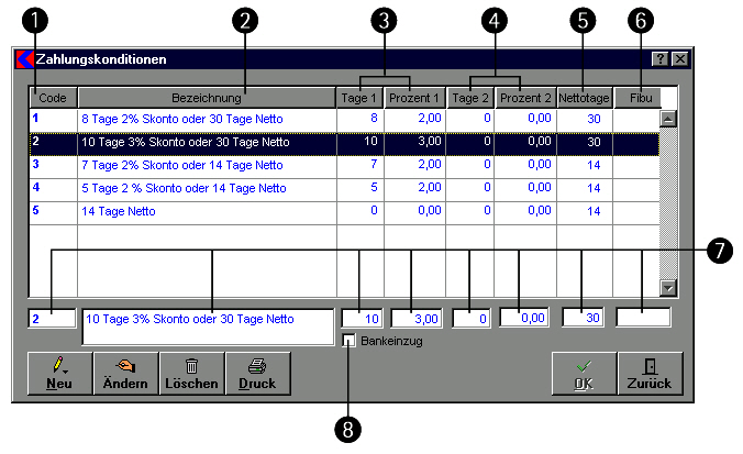 - In der Spalte Bezeichnung werden alle bereits angelegten Zahlungsbedingungen mit Namen angezeigt. Es empfiehlt sich, für die leichtere Zuordnung bei der späteren Andressanlage, ausführlich beschreibende Bezeichnungen wie z.B. "7 Tage 2 %, 14 Tage netto" zu wählen.