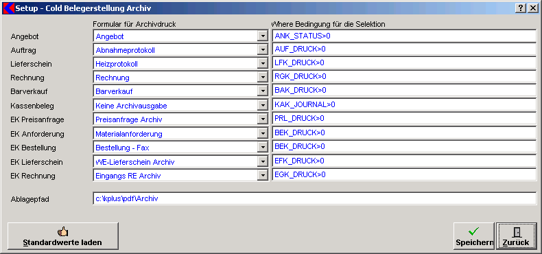 JET DMS - Cold Belege SetupAlle Belege die nicht über Scanner in die DMS gelangen, müssen aus Kplus generiert werden. Hier stellen Sie ein, welche Belege mit welchem Formular und mit welchen Bedingungen erzeugt werden sollen.
