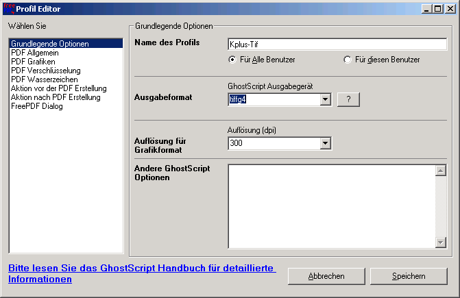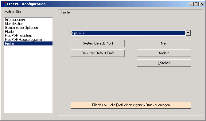 Wählen Sie hier den Eintrag Profile und legen mit einem Klick auf die Schaltfläche Neu ein neues Profil mit dem Namen Kplus-tif an.