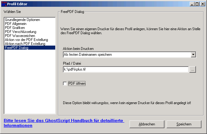 Im Bereich FreePDF Dialog stellen Sie die Aktion beim Drucken auf Als festen Dateinamen speichern. Nun erstellen Sie mit einem Klick auf die Schaltfläche