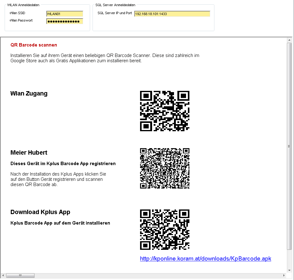 Client InstallationBevor man einen Client anmelden kann, muss man das Wlan so konfigurieren, dass 1 Port durch das Wlan direkt auf die Datenbank verweist. Dies verwalten Sie unter Personalstamm im Reiter Damit die unten angeführten Barcodes funktionieren, geben Sie die Wlan SSID, das Passwort sowie die IP des Servers samt dem Port an.
